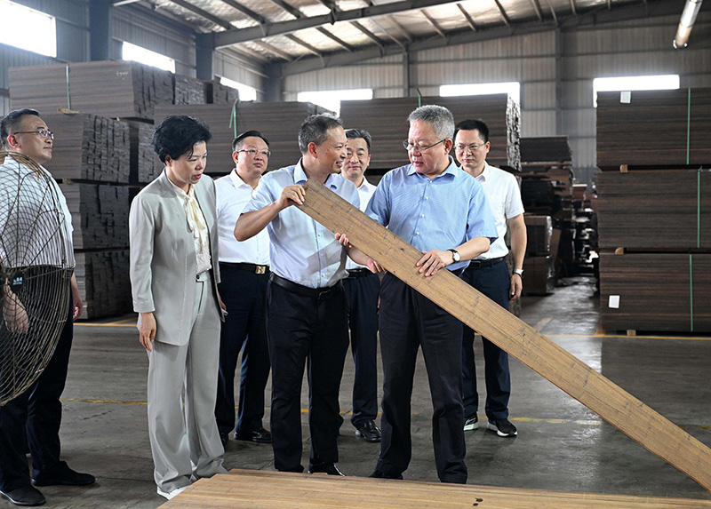 2025年6月16日,省政協(xié)副主席虢正貴來湖南桃花江竹材科技股份有限公司調(diào)研生態(tài)資源轉(zhuǎn)化與特色產(chǎn)業(yè)融合發(fā)展。公司董事長、省人大代表薛志成陪同并介紹情況。虢正貴充分肯定了桃花江竹材在竹資源利用及竹特色產(chǎn)業(yè)融合發(fā)展所取得的成果,他鼓勵企業(yè)繼續(xù)發(fā)揮龍頭優(yōu)勢,充分利用好桃江資源稟賦和產(chǎn)業(yè)優(yōu)勢,深化產(chǎn)學(xué)研融合,提升竹產(chǎn)業(yè)附加值,為民族地區(qū)生態(tài)資源高效轉(zhuǎn)化和特色產(chǎn)業(yè)融合發(fā)展探索更多經(jīng)驗。